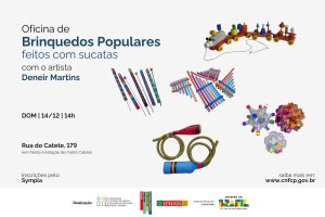O Centro Nacional de Folclore e Cultura Popular (CNFCP/Iphan) realizará, no dia 14 de dezembro, às 14h, a Oficina de Brinquedos Populares feitos com sucatas, conduzida pelo artista fluminense Deneir Martins, na Biblioteca Amadeu Amaral. A atividade integra a programação educativa do Museu de Folclore e é um convite para vivenciar processos criativos que dialogam com sustentabilidade, memória afetiva e inventividade.